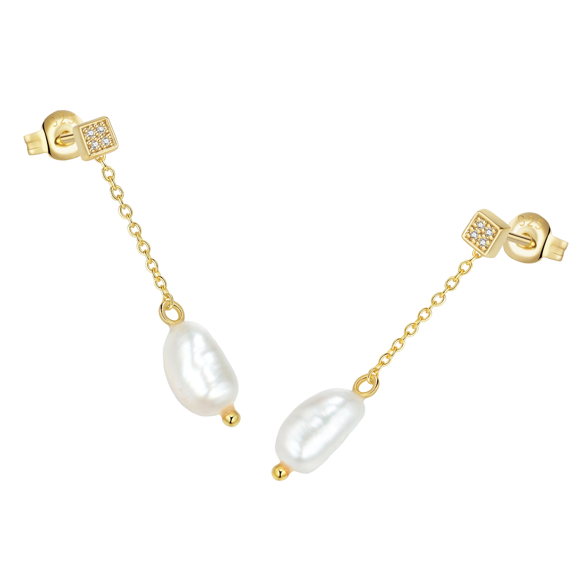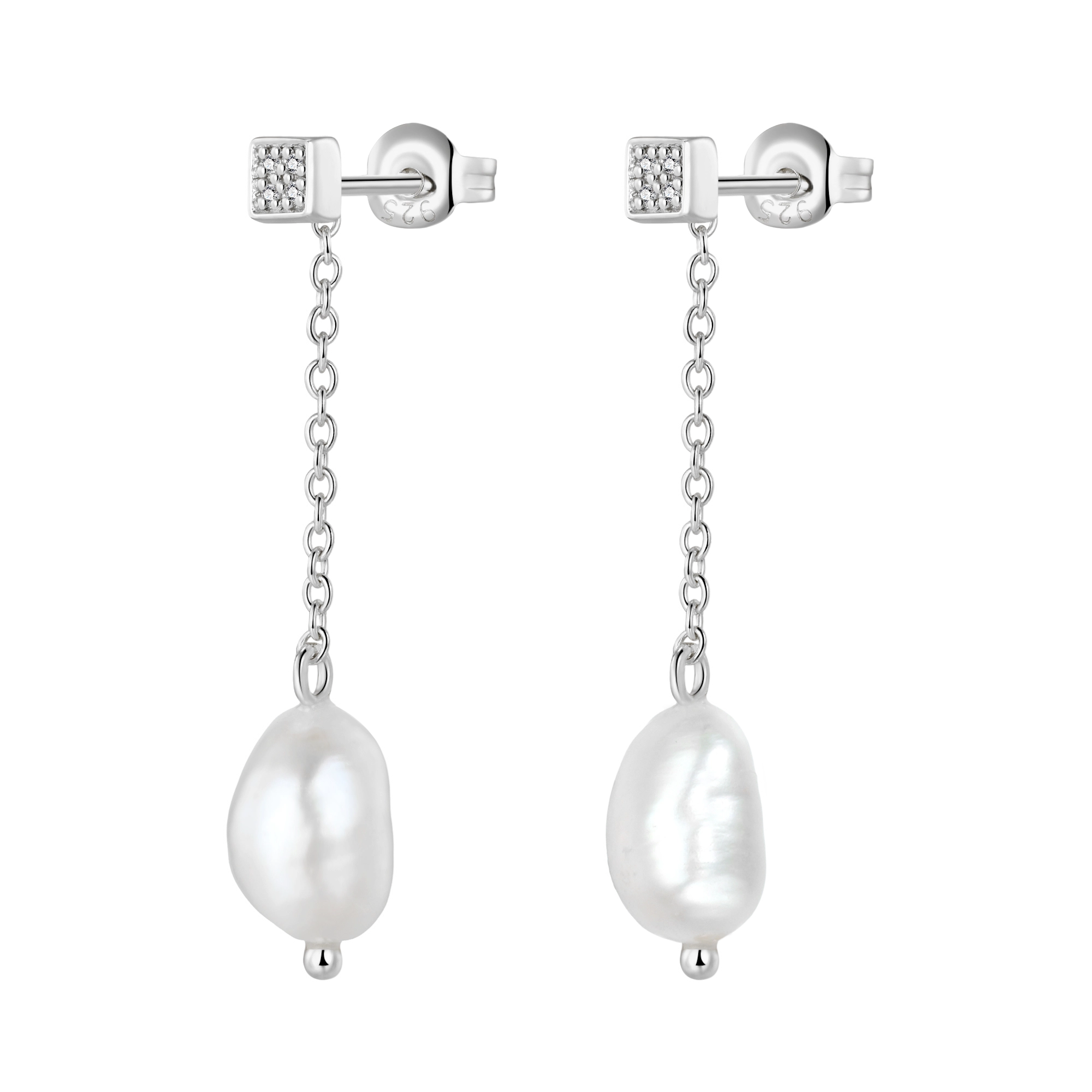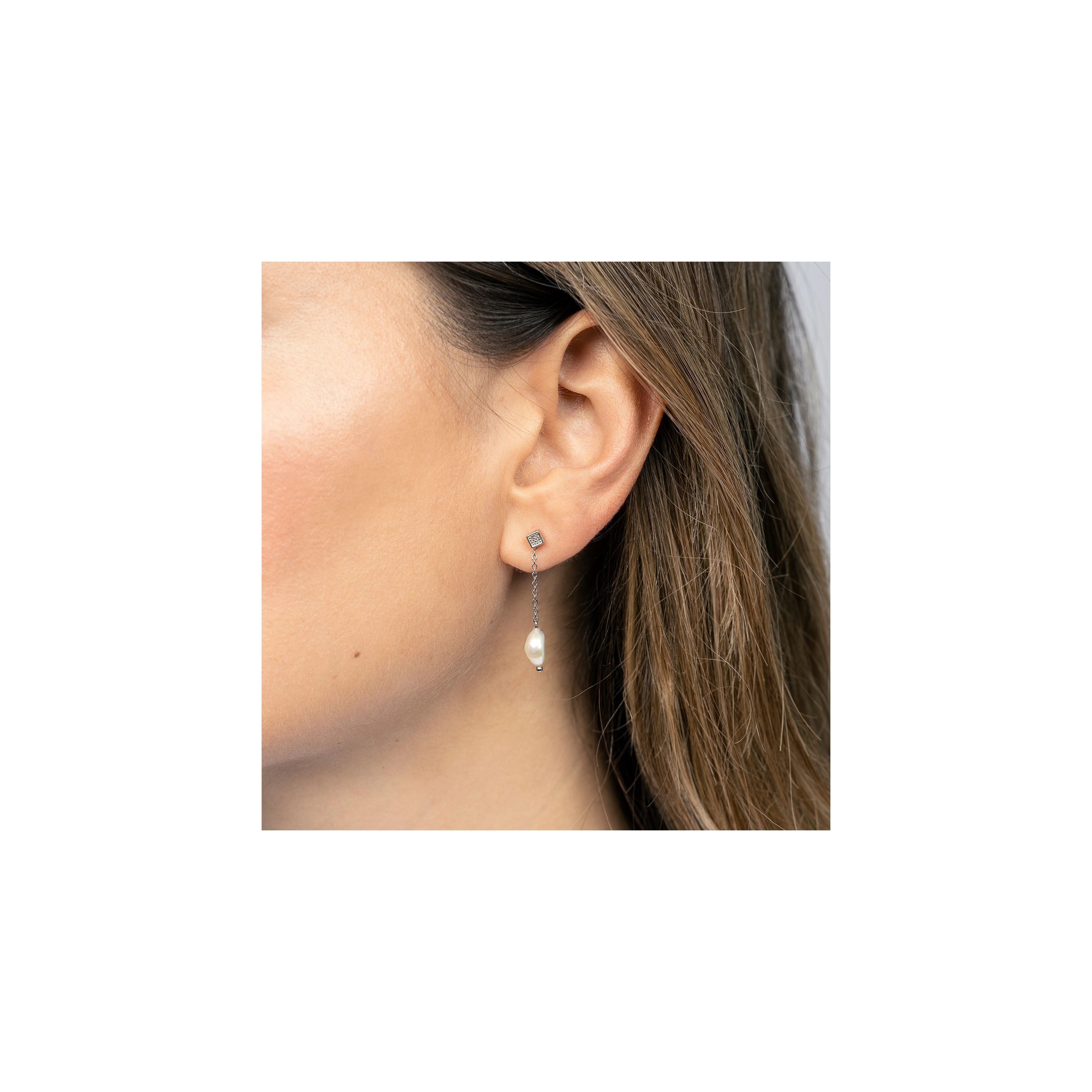 Embrace the celestial grace of the air element — each square stud sparkles with 4x natural diamonds, like stars set against a serene evening sky. A delicate chain flows effortlessly below, leading to a luminous baroque pearl that dances with every movement.