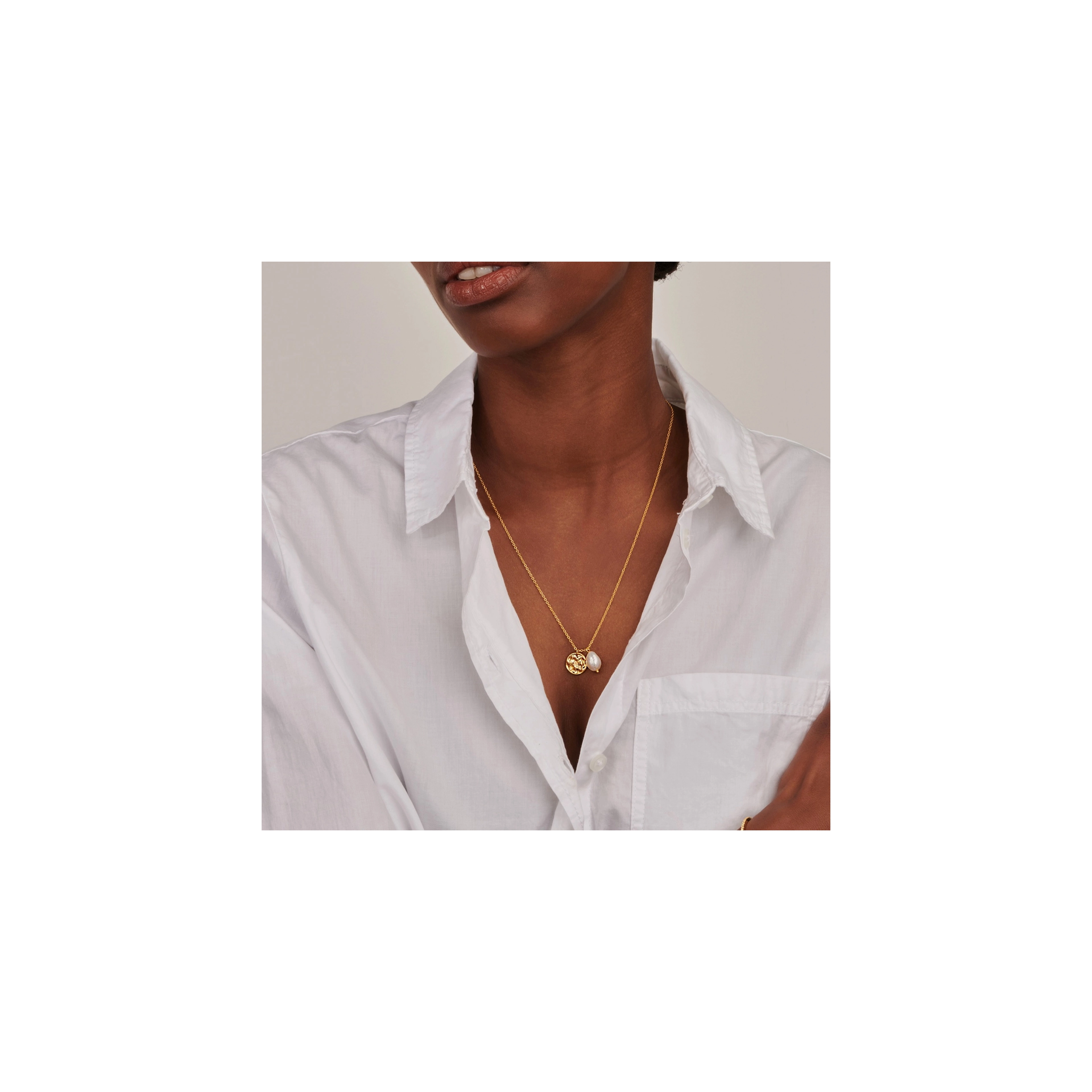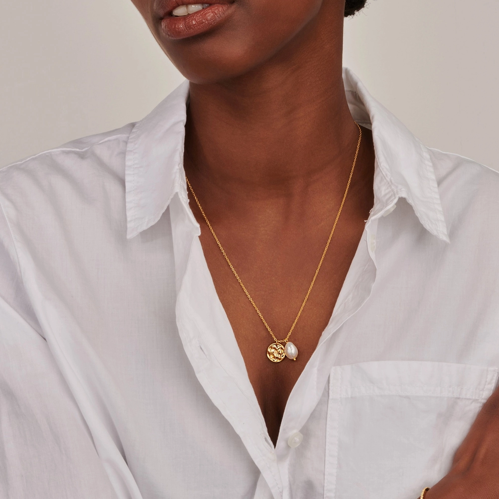 A hammered amulet pendant with 1x white diamond and baroque pearl, your signature everyday casual chic style. Excellent for layering with our Audrey choker.