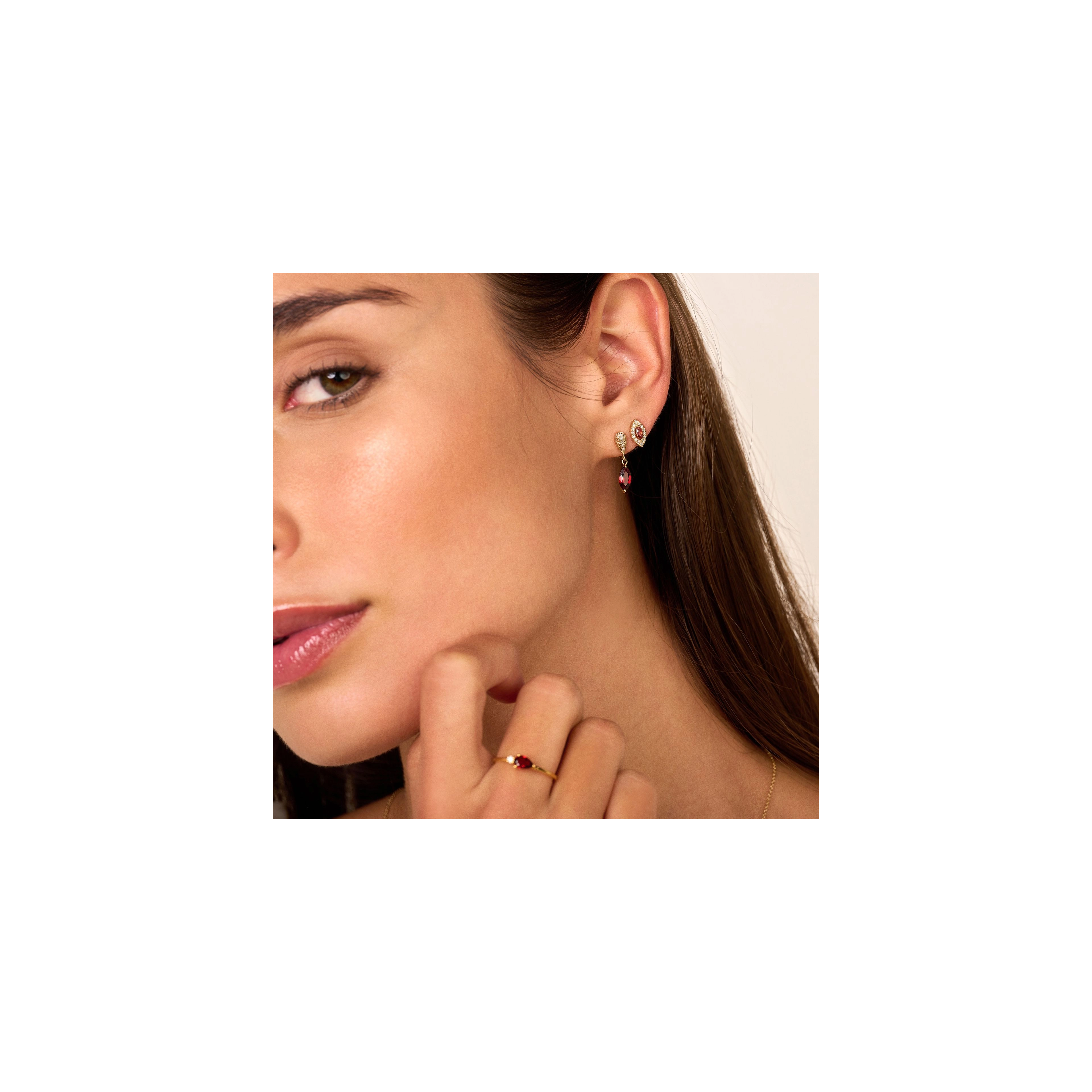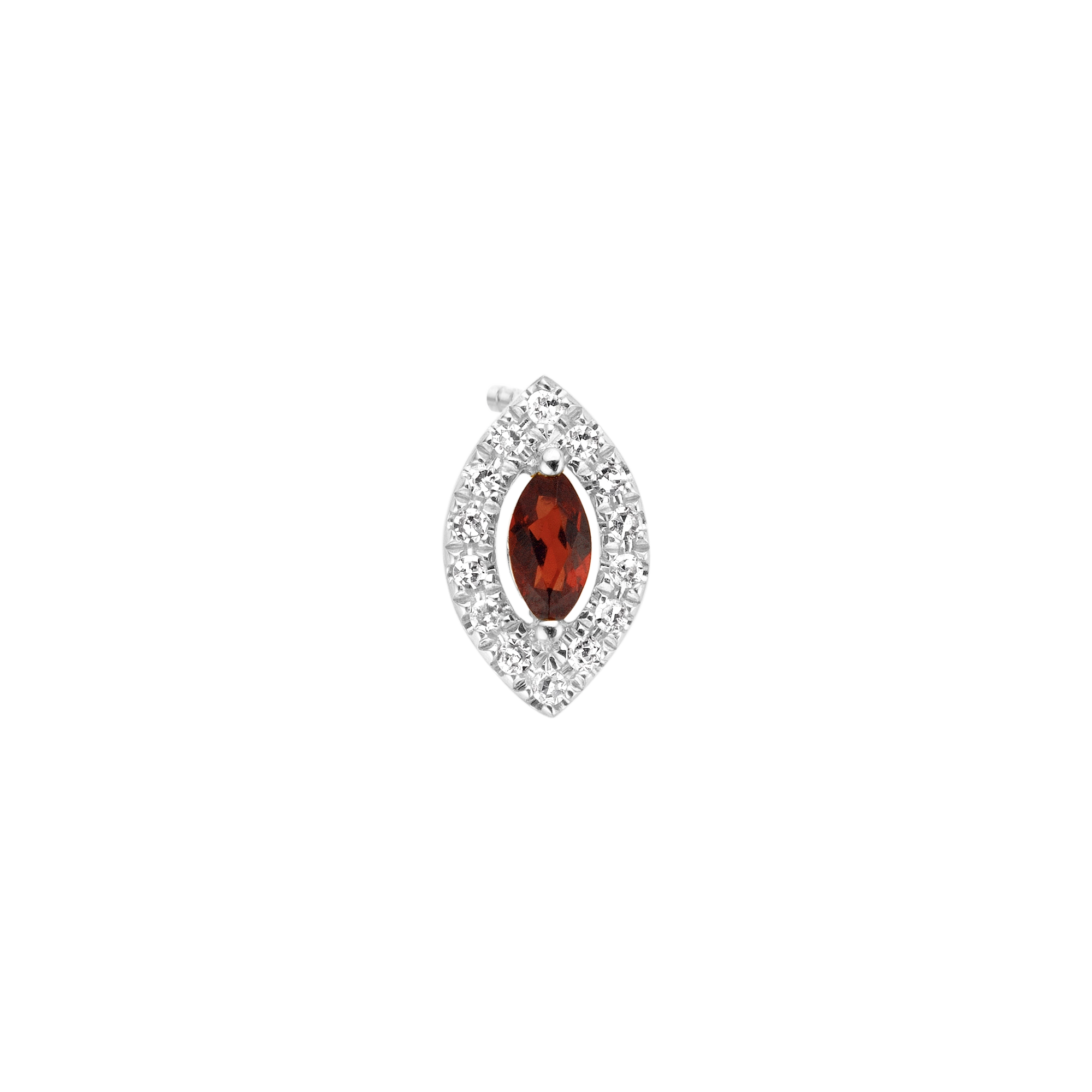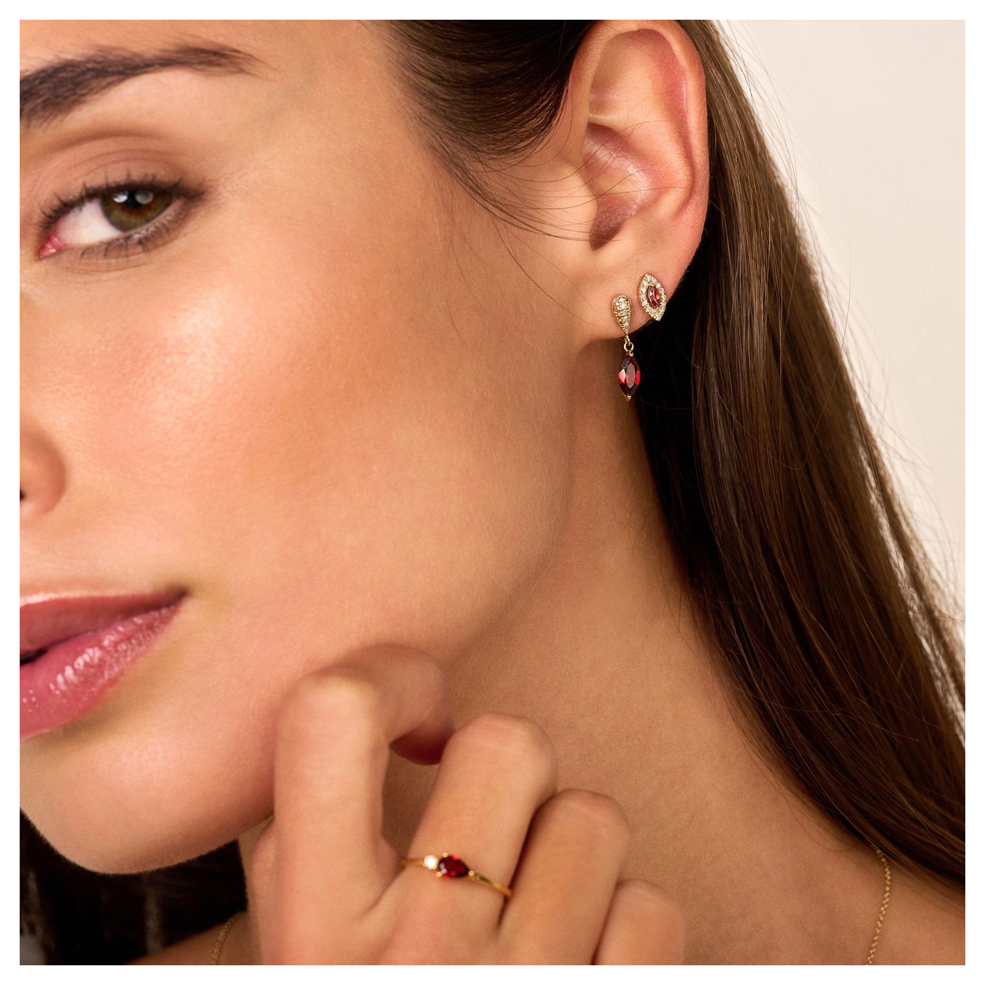 Reminiscing the glorious golden days, this fine marquise-shaped red Garnet is the beating heart of this 14 carat gold single earring. Representing true grandeur by its 14x luxurious diamonds.