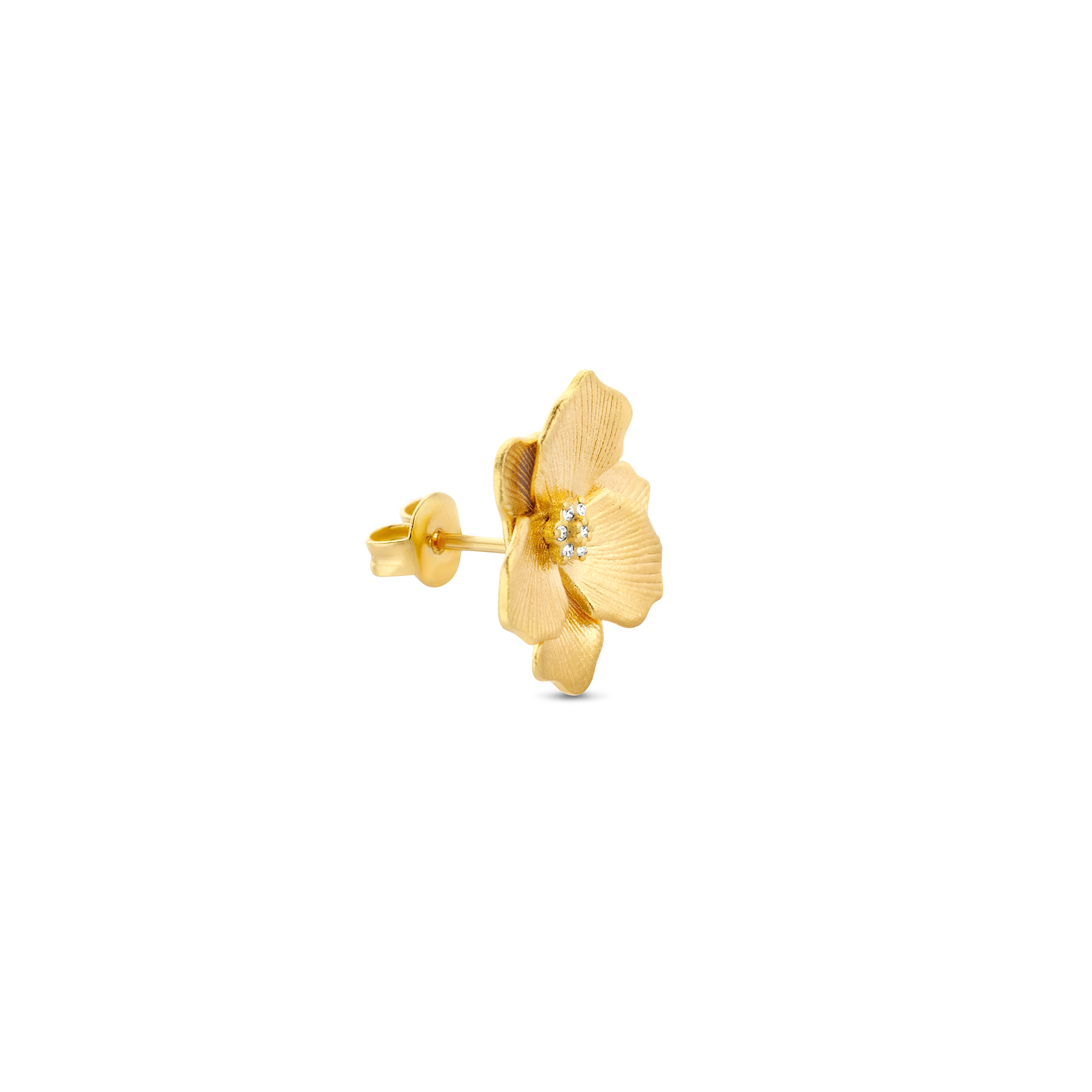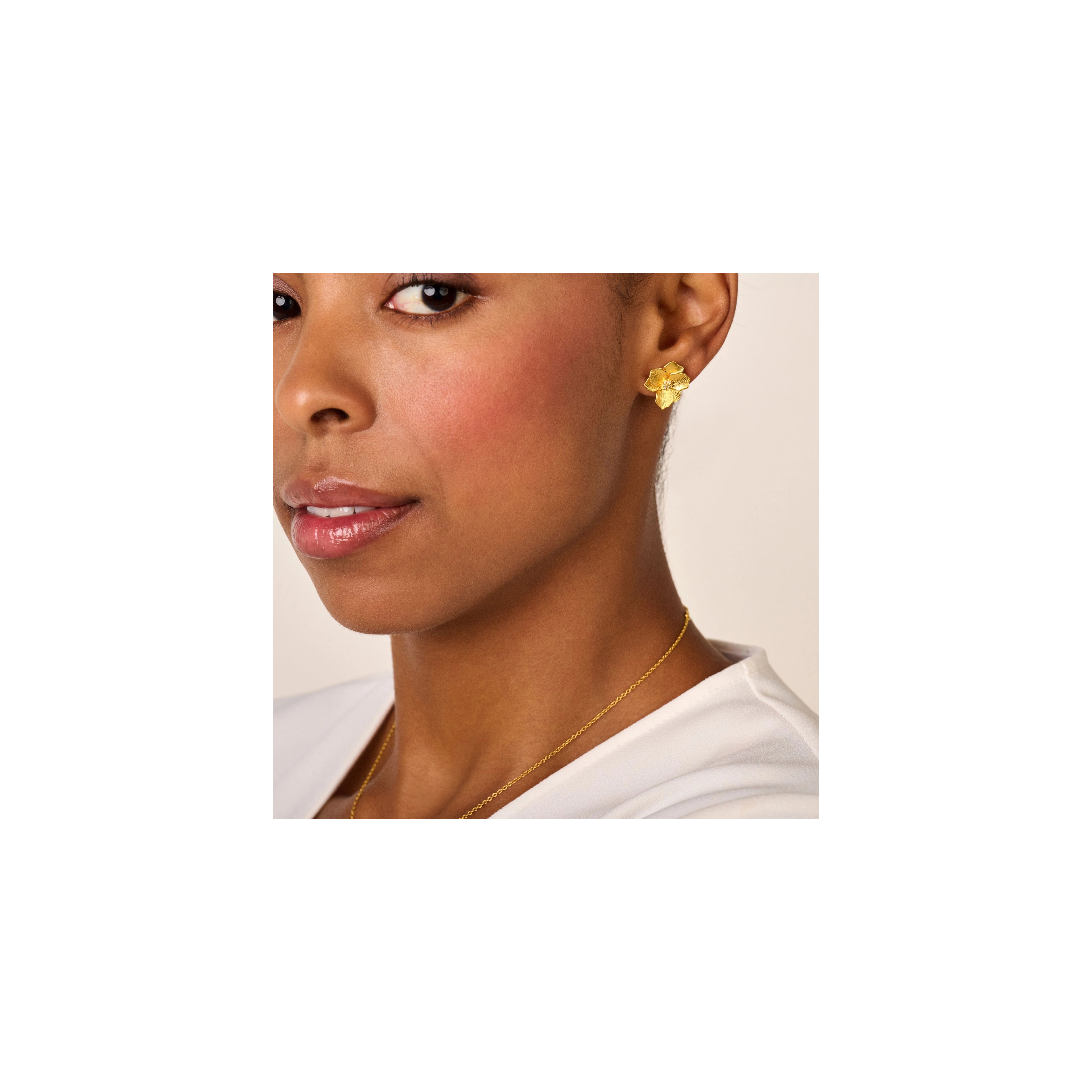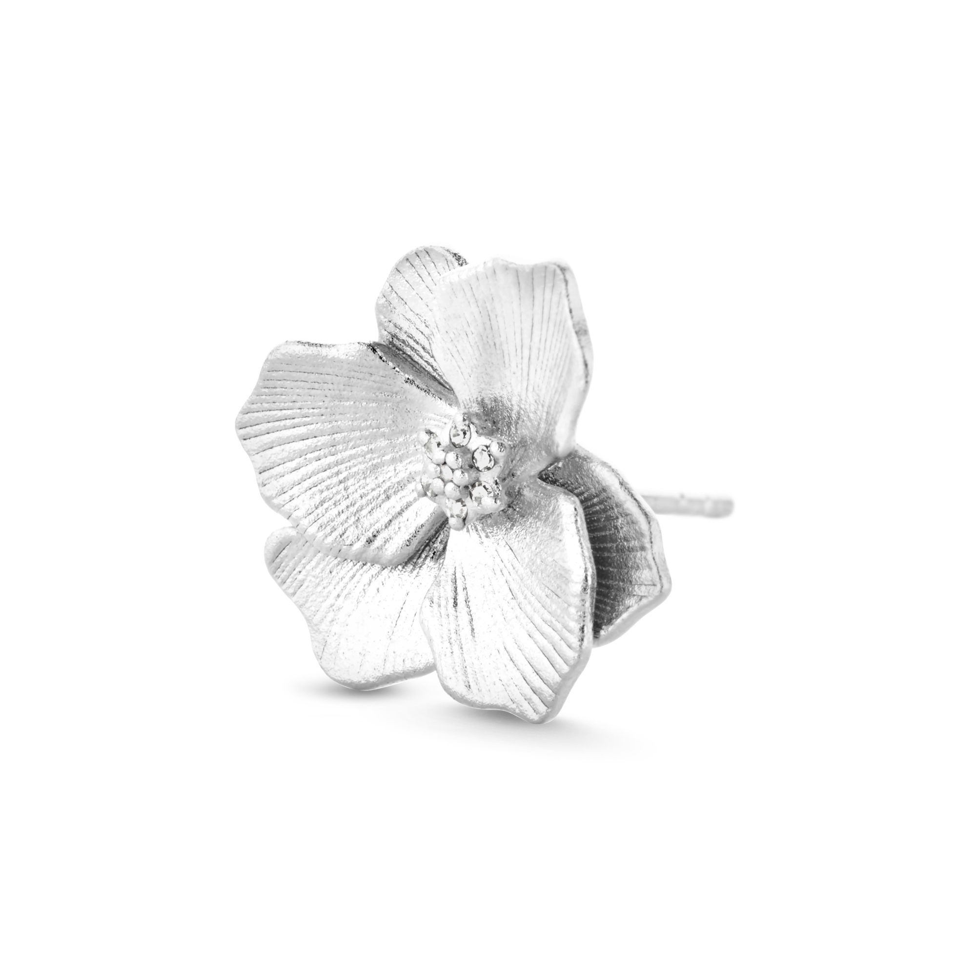 A delicately detailed and engraved Jasmine flower, with a brightly gleaming diamond heart, handset in a rustic brushed finish. Whatever the season, this single stud will spark an immediate burst of springtime happiness.P.S.: This stud also comes in a larger edition for a more outgoing look or to play with a variety of sizes, whatever tickles your pickle.