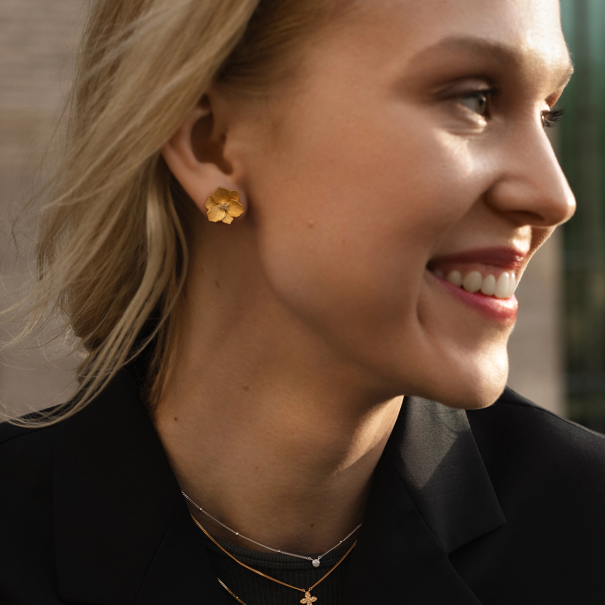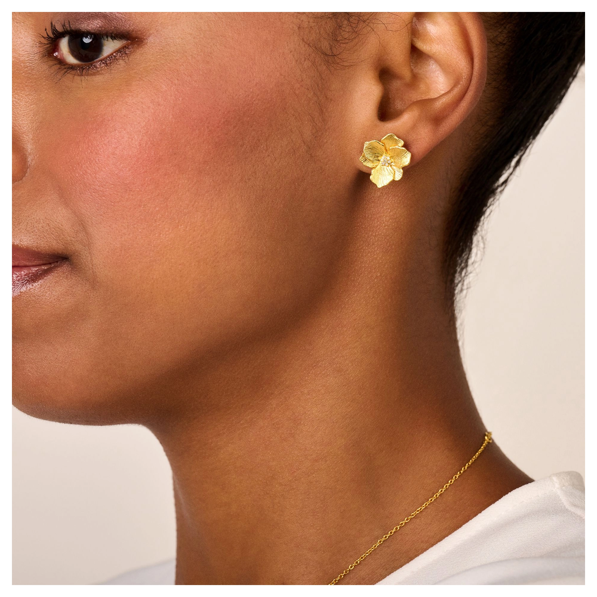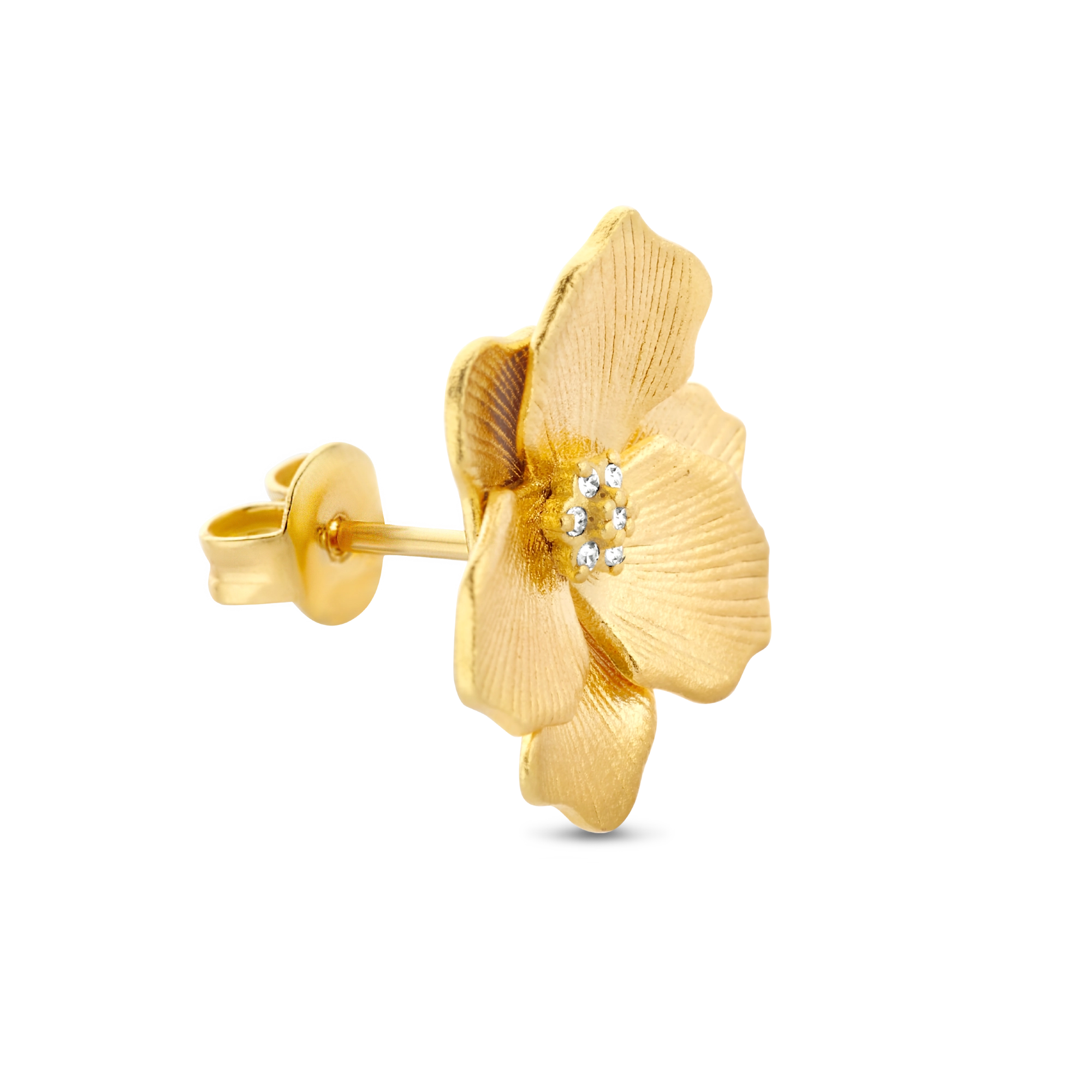 A delicately detailed and engraved Jasmine flower, with a brightly gleaming diamond heart, handset in a rustic brushed finish. Whatever the season, this single stud will spark an immediate burst of springtime happiness.P.S.: This stud also comes in a larger edition for a more outgoing look or to play with a variety of sizes, whatever tickles your pickle.