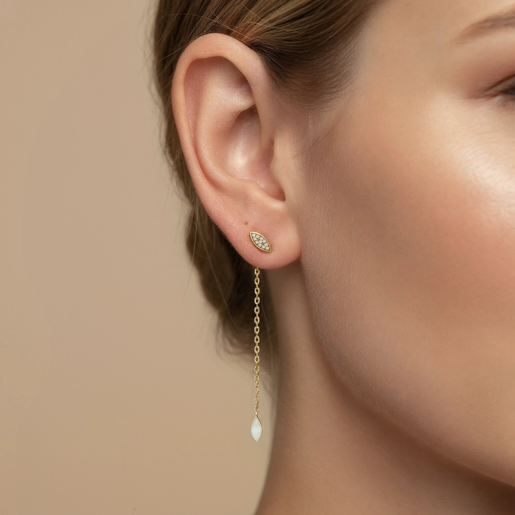 Shake your tail feather with these captivating earrings, where each marquise-shaped stud shimmers with 6x handset natural diamonds. From the butterfly lock, a delicate chain swings gracefully behind the earlobe, ending in a brushed marquise pendant that dances with your every move — embodying the peacock’s intricate elegance with a modern, flirty twist.