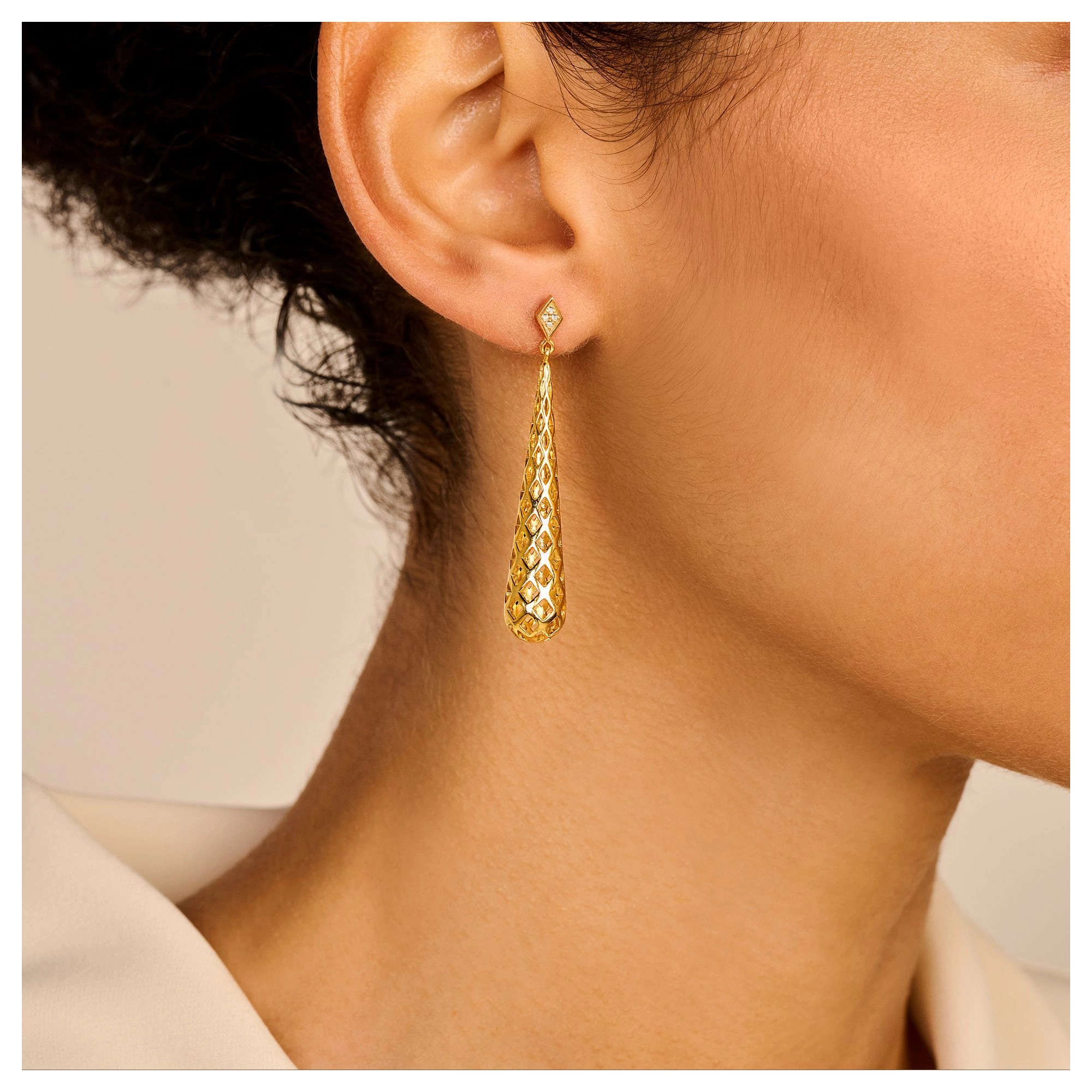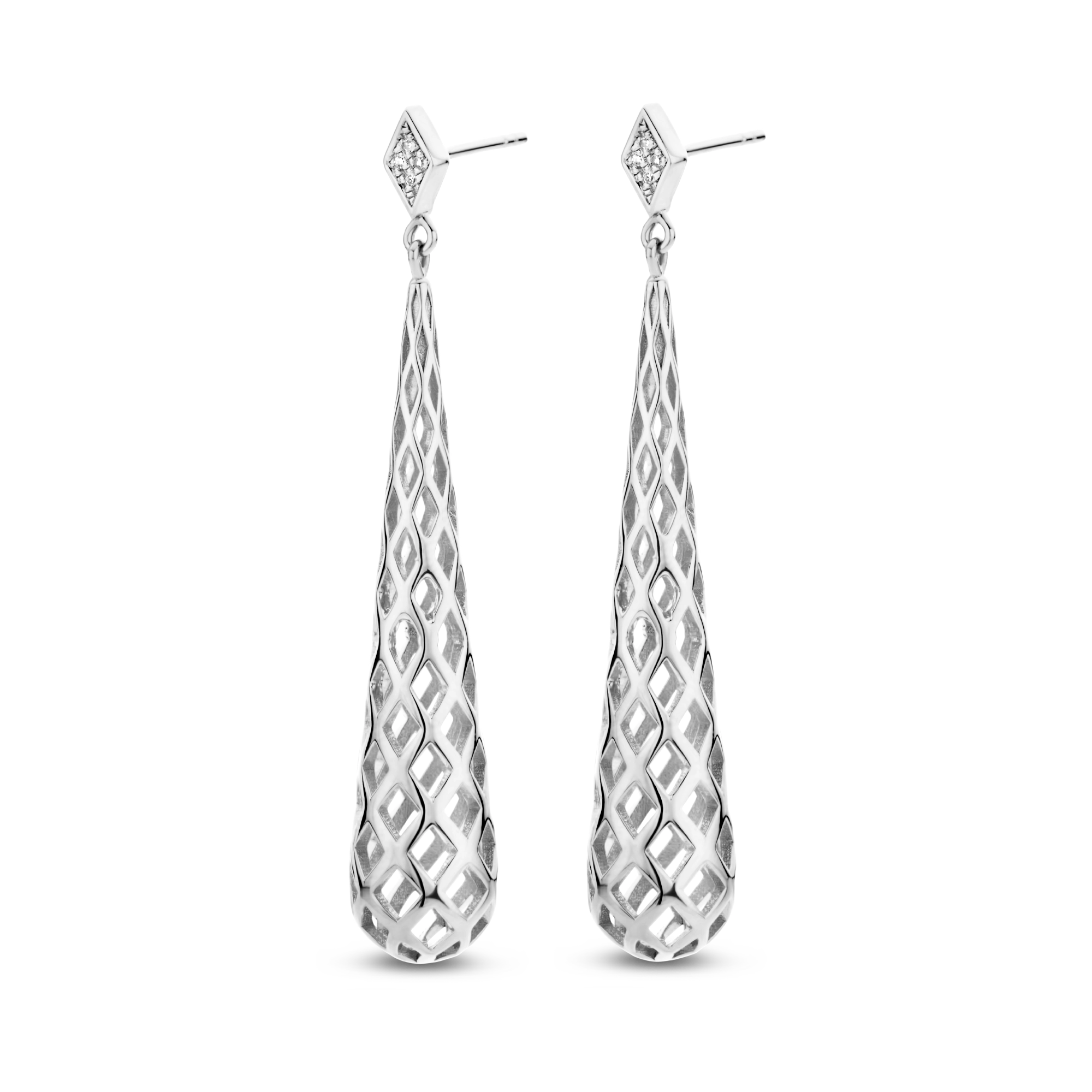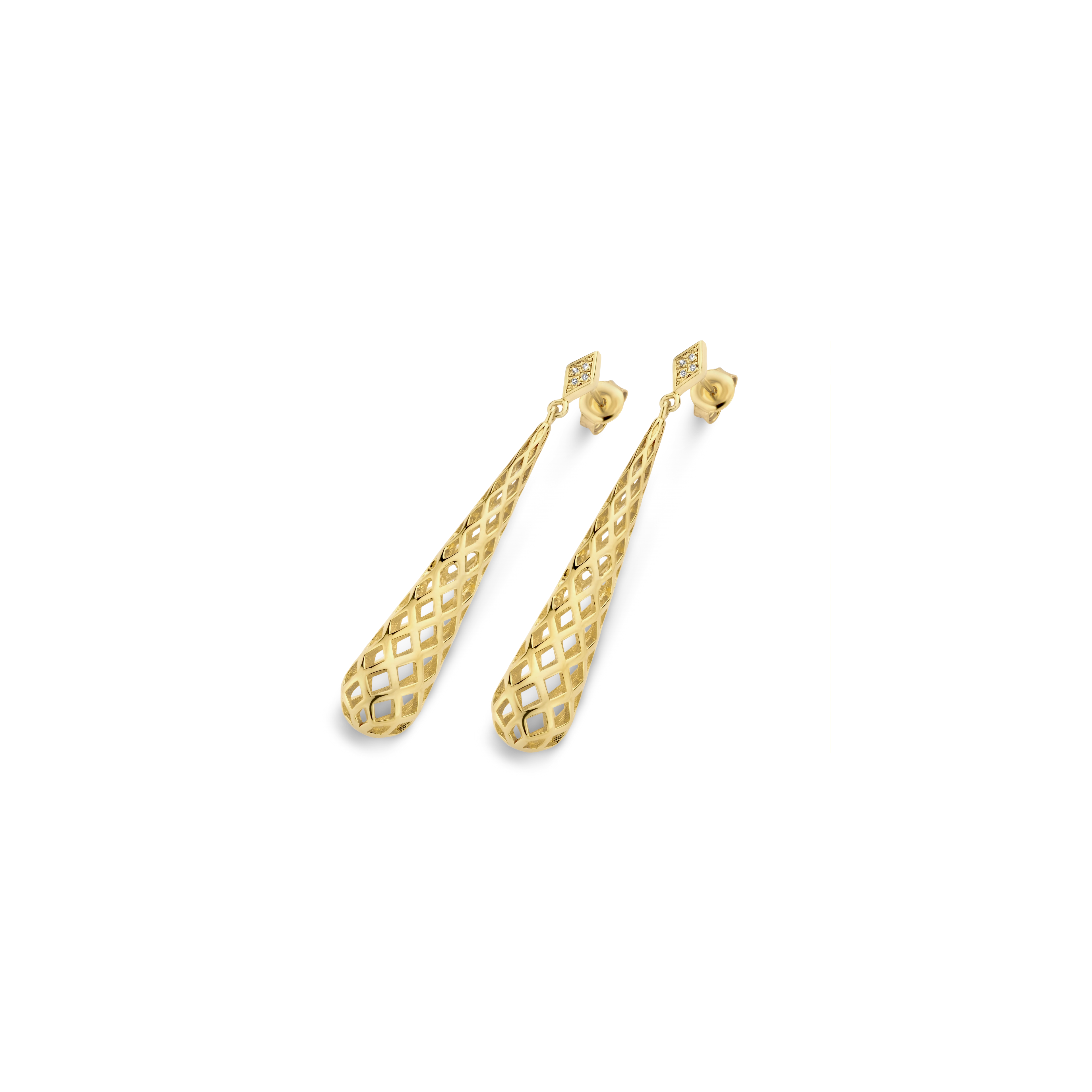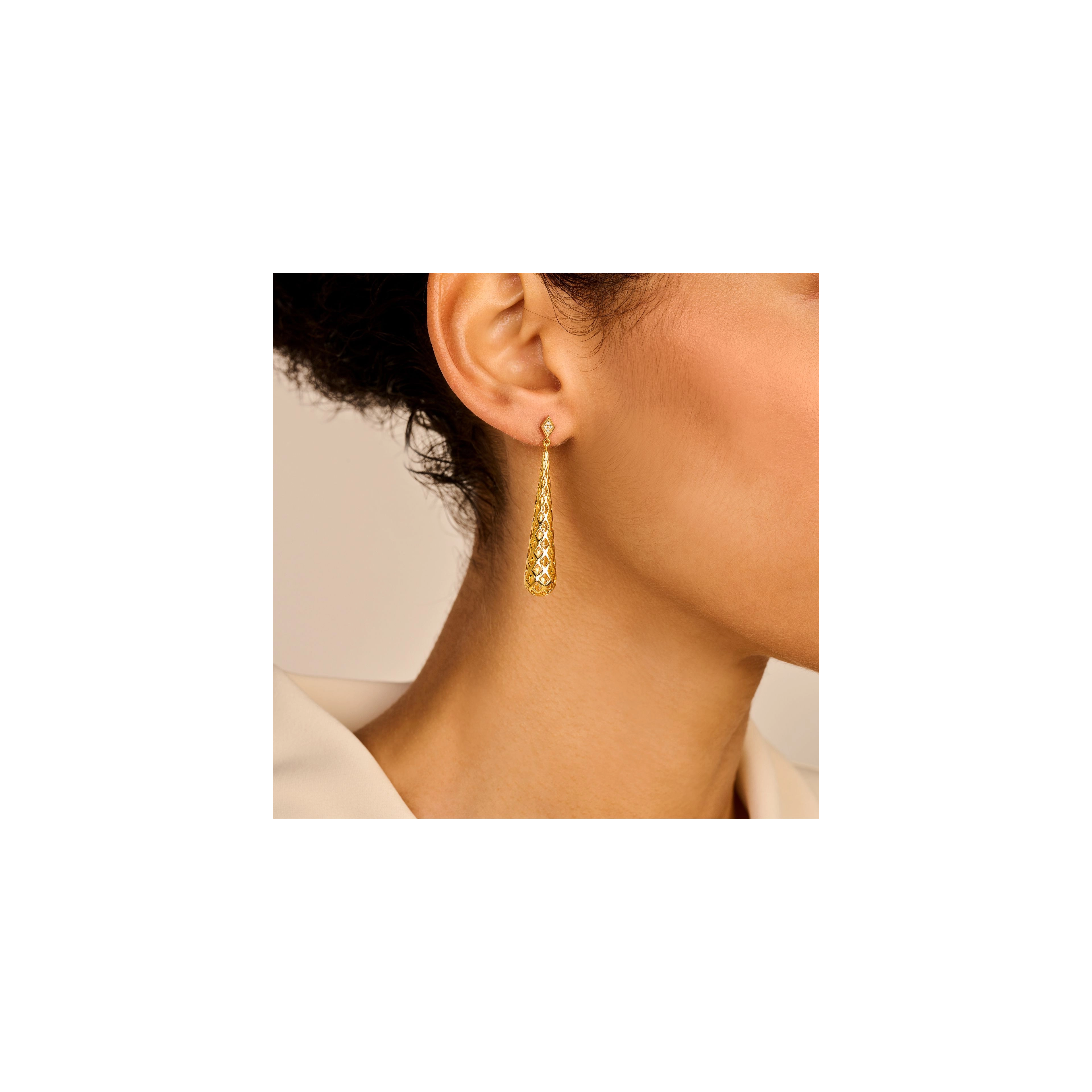 A pair of dripping cone pendants, defined by an intricate honeycomb pattern, on a diamond (8x) rhombus earpiece. Old school glamour just called — it wants its earrings back.