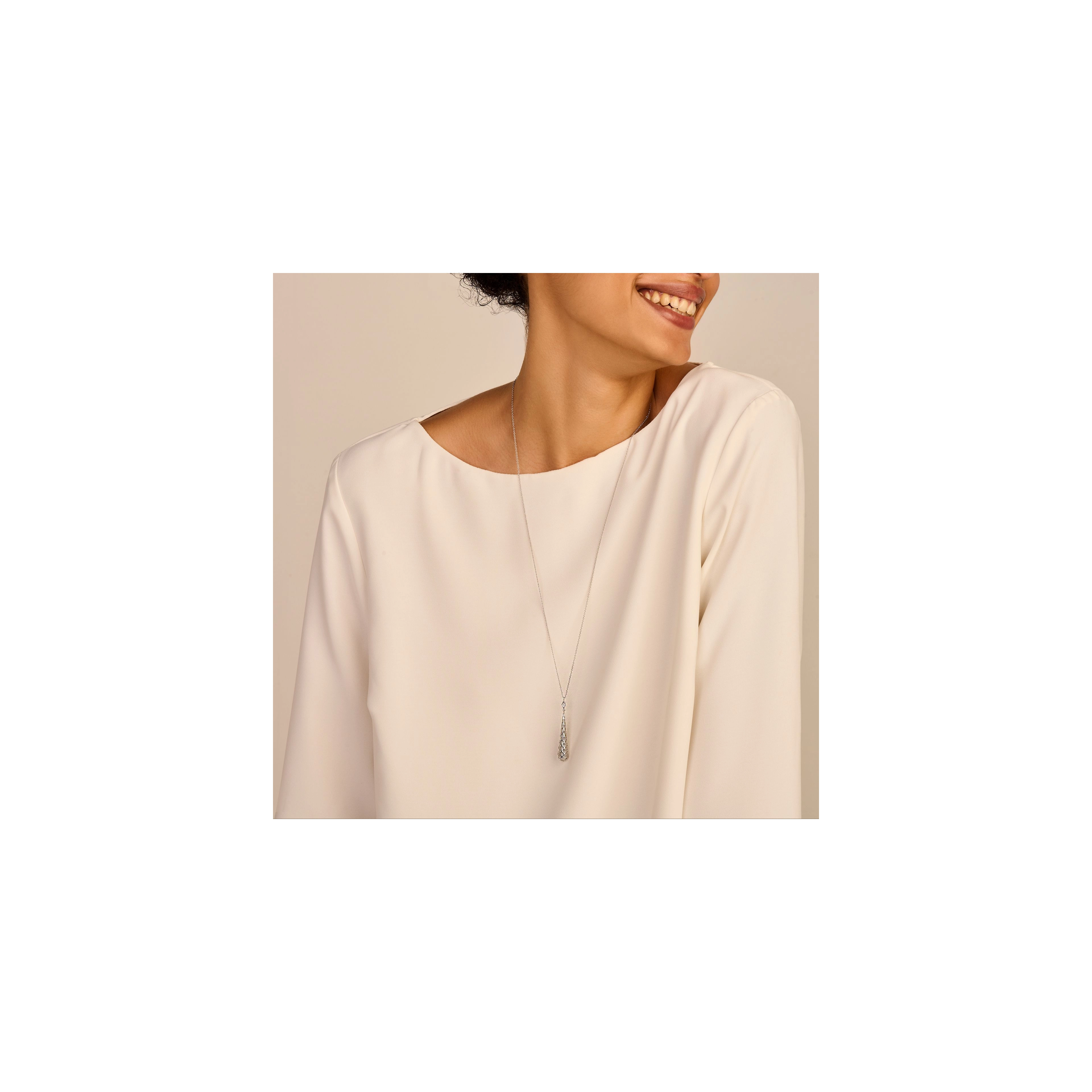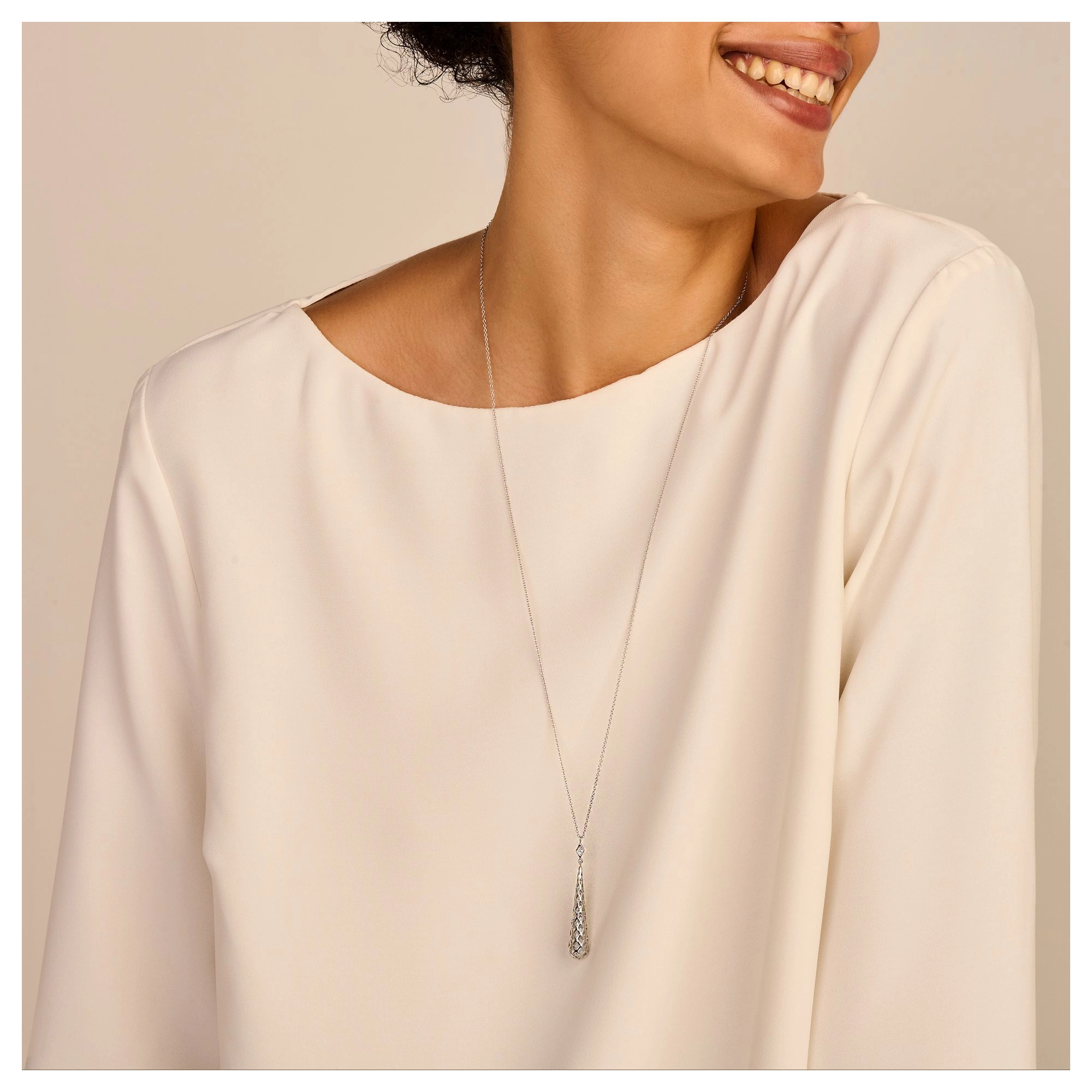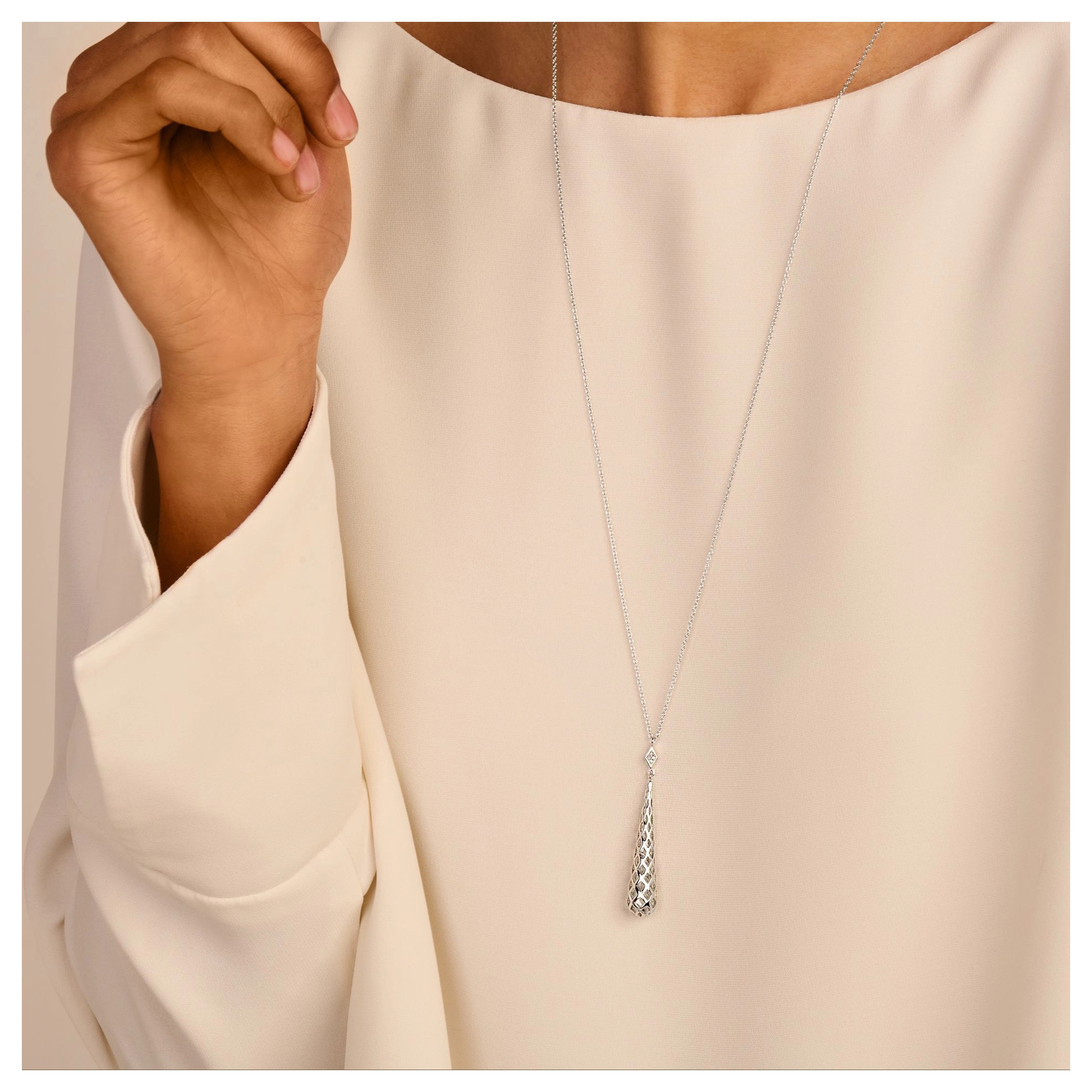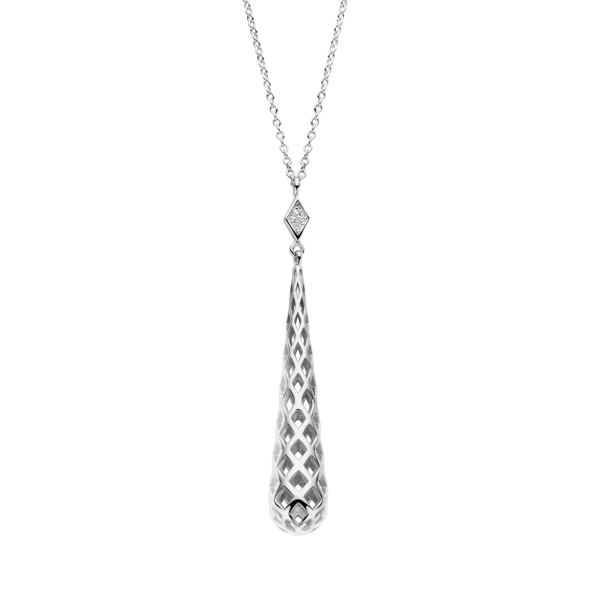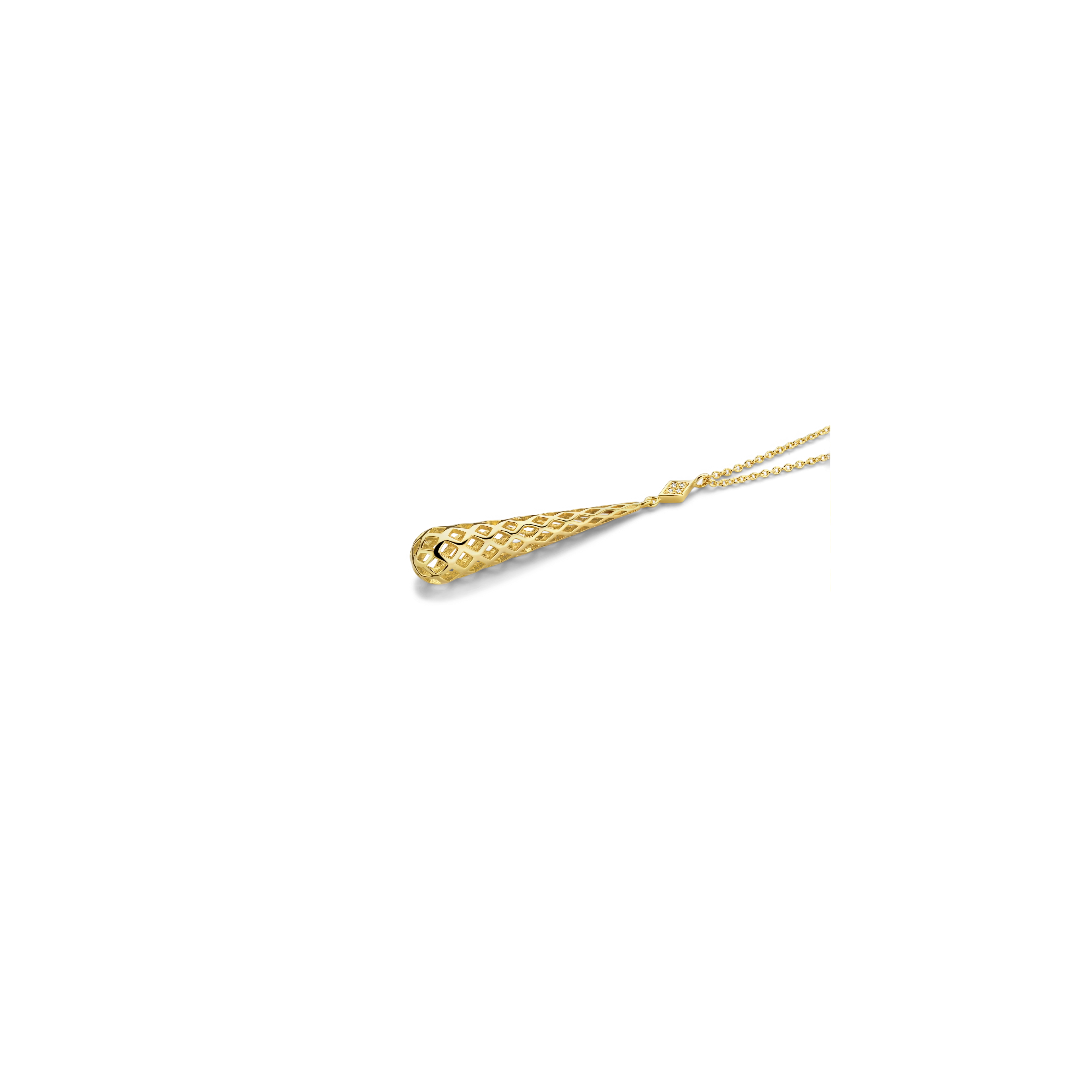 A dripping cone pendant, defi ned by an intricate honeycomb pattern, on a diamond (4x) rhombus. Whether draped on the back or neckline, it will cast an undeniable splash of glamour